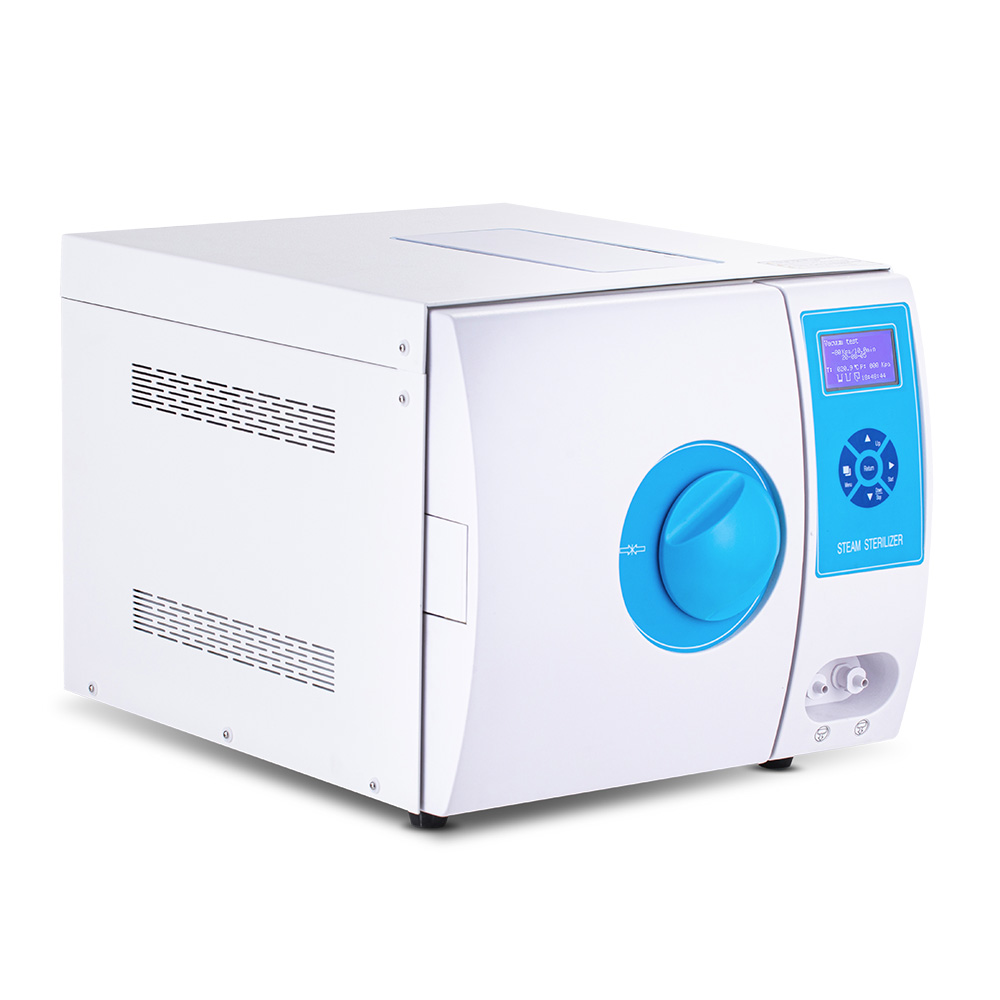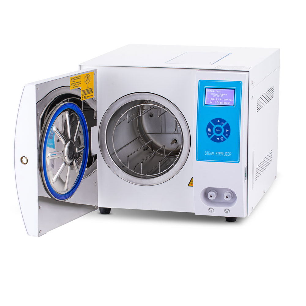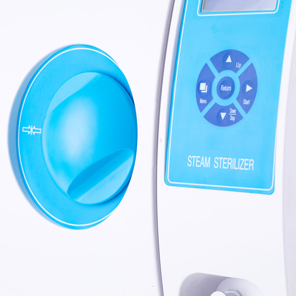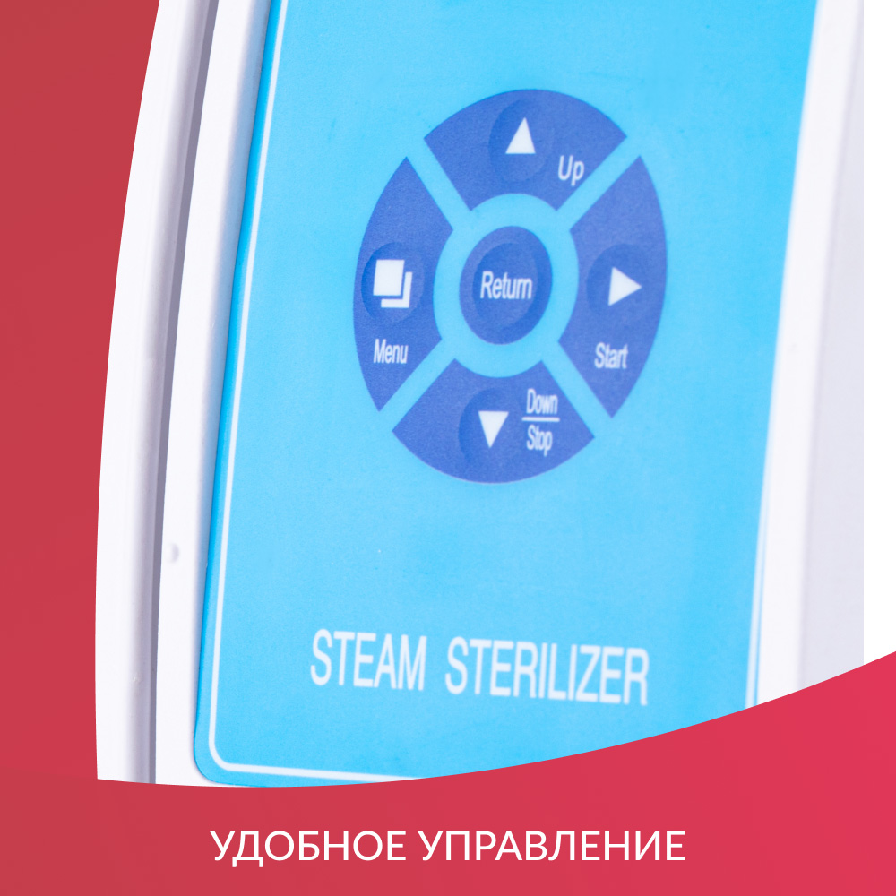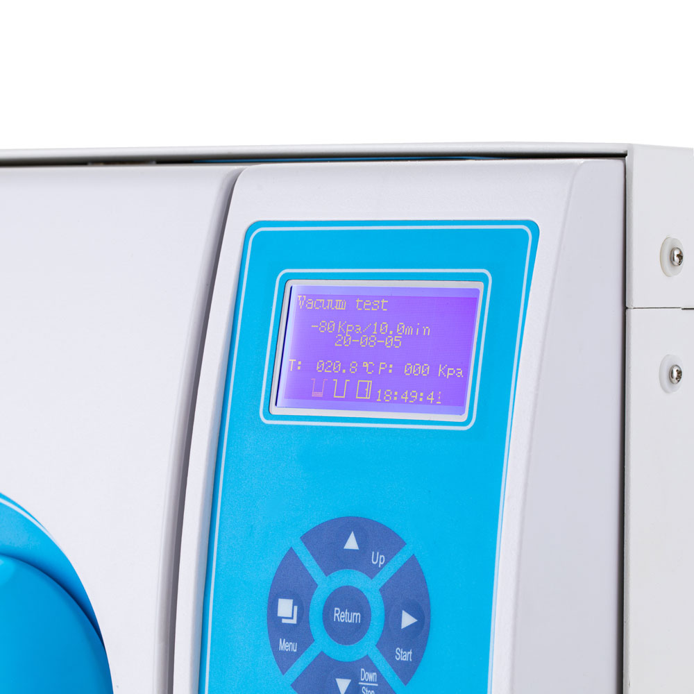 На лицевой панели расположены понятные кнопки управления и информативный ЖК-дисплей, на котором отображается дата, выбранная рабочая программа, температура в камере, время стерилизации, подключение термопринтера, количество чистой и отработанной воды, положение дверцы стерилизатора, а также температура и давление в помещении, где установлен прибор.
