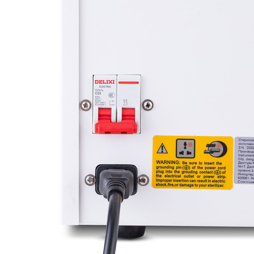 Для безопасности работы предусмотрена термозащита нагревательного элемента стерилизатора и предохранительный клапан на случай превышения допустимого давления в камере. После 15 минут бездействия происходит автоматическая блокировка дверцы, а при опустошении водяного бака и переполнении бака для отработанной воды раздаётся звуковой сигнал.