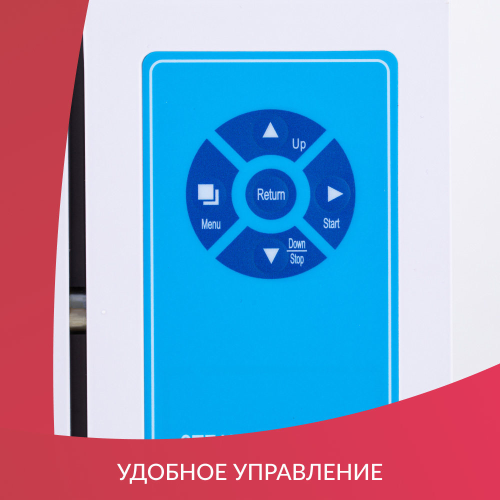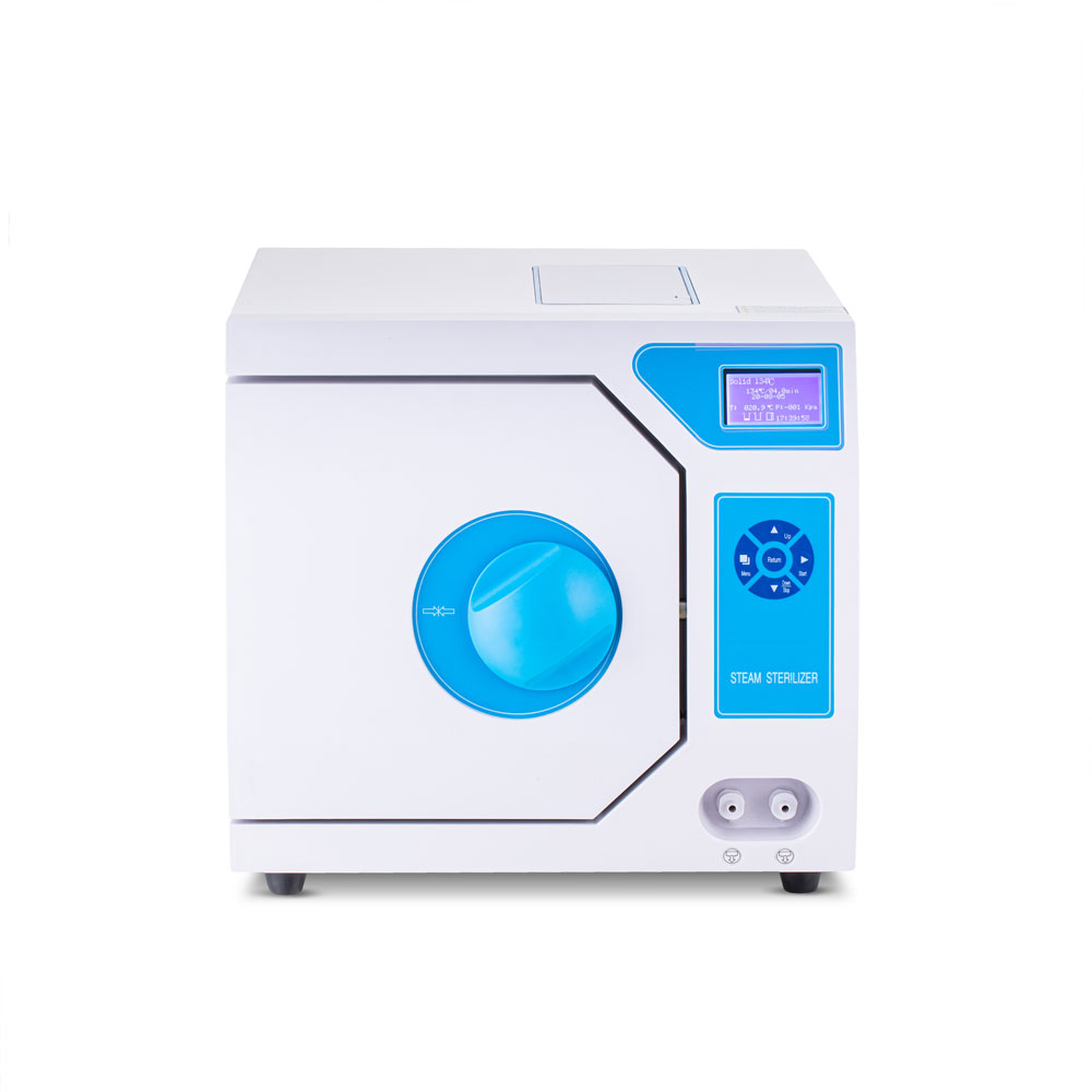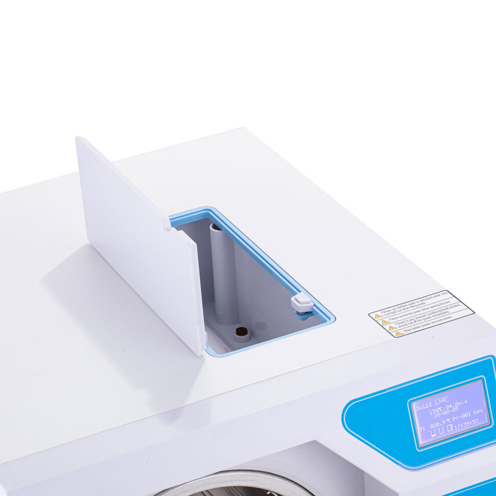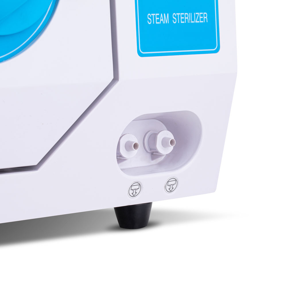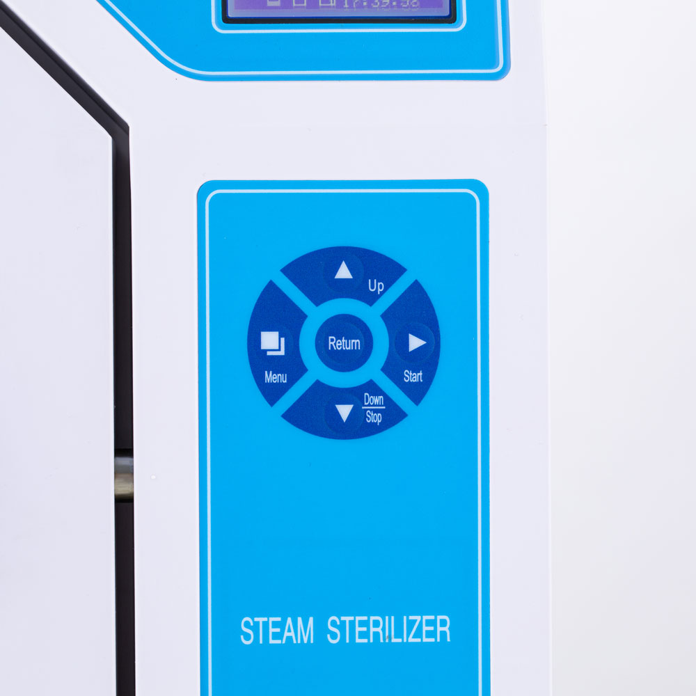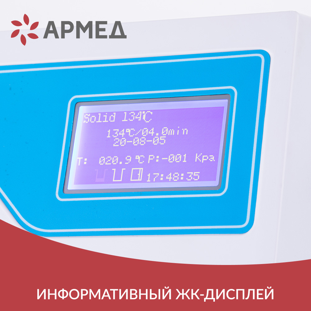 На лицевой панели расположены понятные кнопки управления и информативный ЖК-дисплей, на котором отображается дата, выбранная рабочая программа, температура в камере, время стерилизации, подключение термопринтера, количество чистой и отработанной воды, положение дверцы стерилизатора, а также температура и давление в помещении, где установлен прибор.