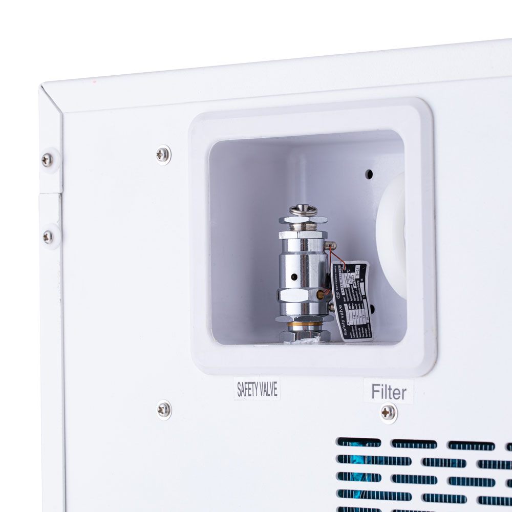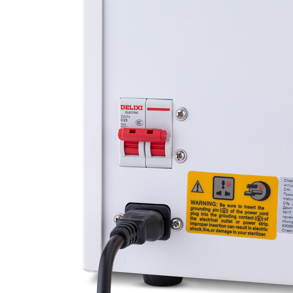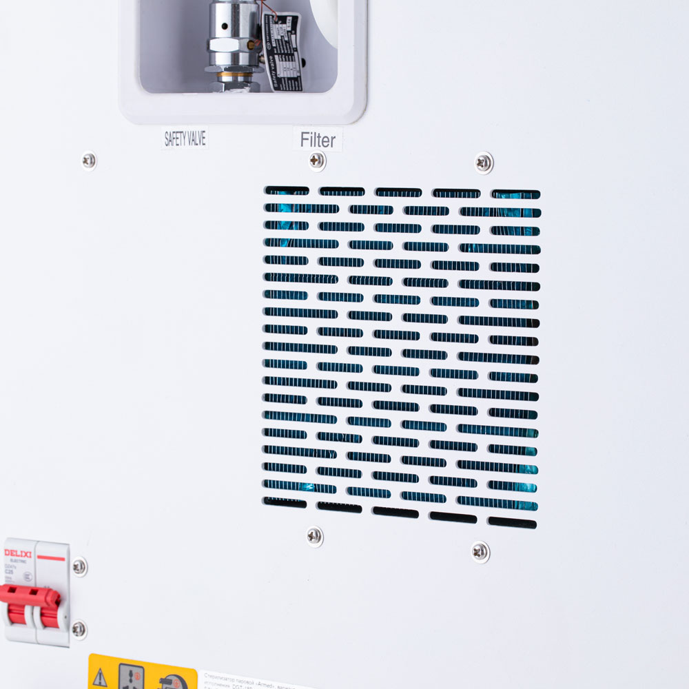 Для безопасности работы предусмотрена термозащита нагревательного элемента стерилизатора и предохранительный клапан на случай превышения допустимого давления в камере. После 15 минут бездействия происходит автоматическая блокировка дверцы, а при опустошении водяного бака и переполнении бака для отработанной воды раздаётся звуковой сигнал.