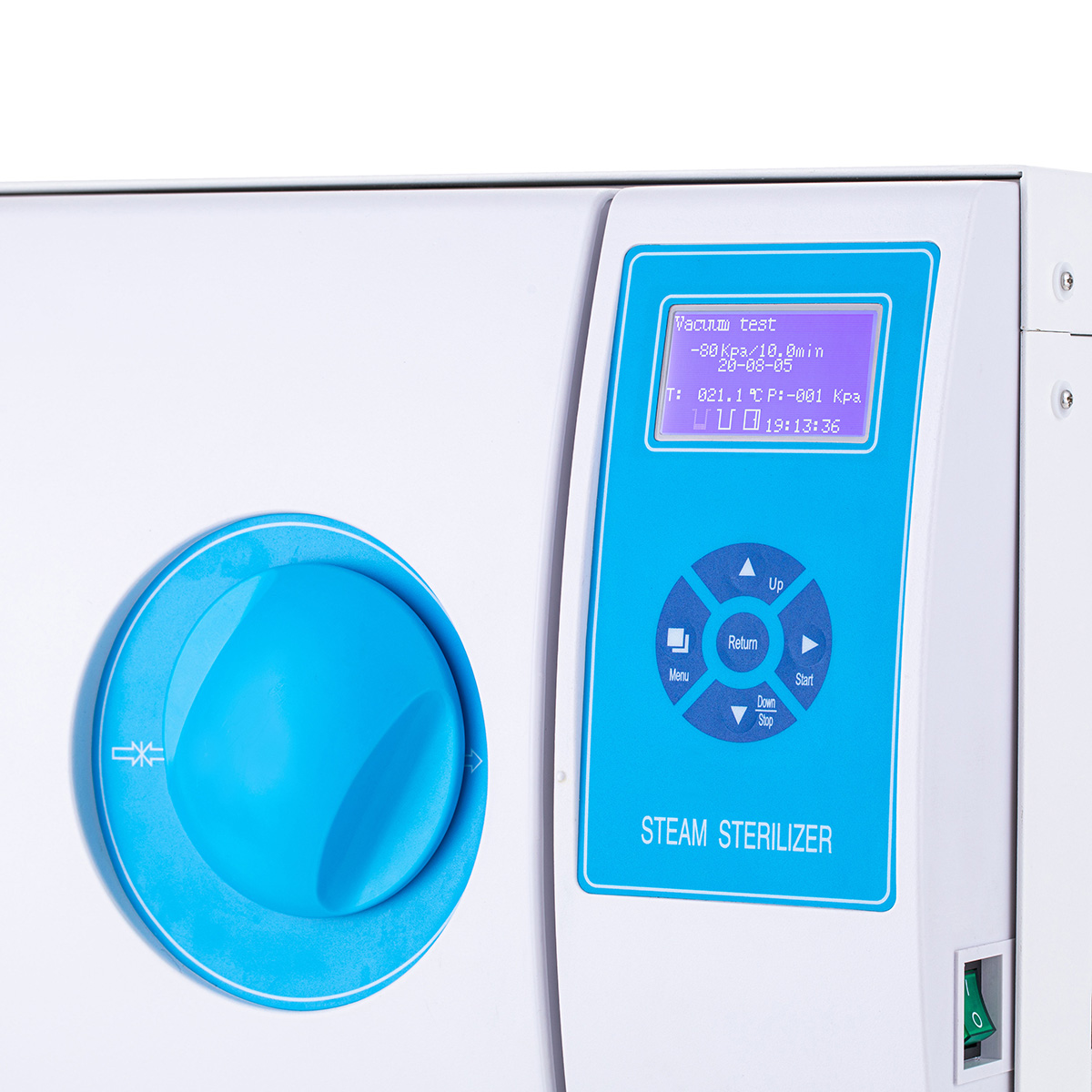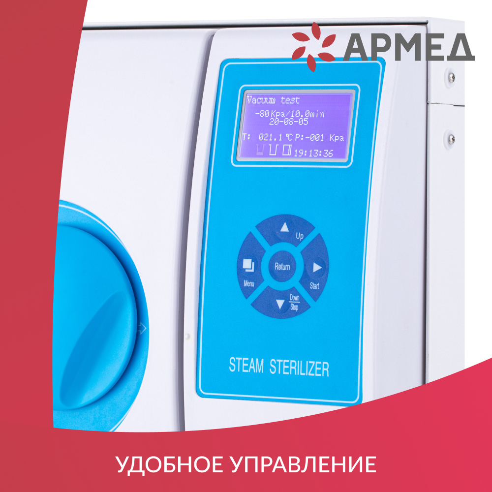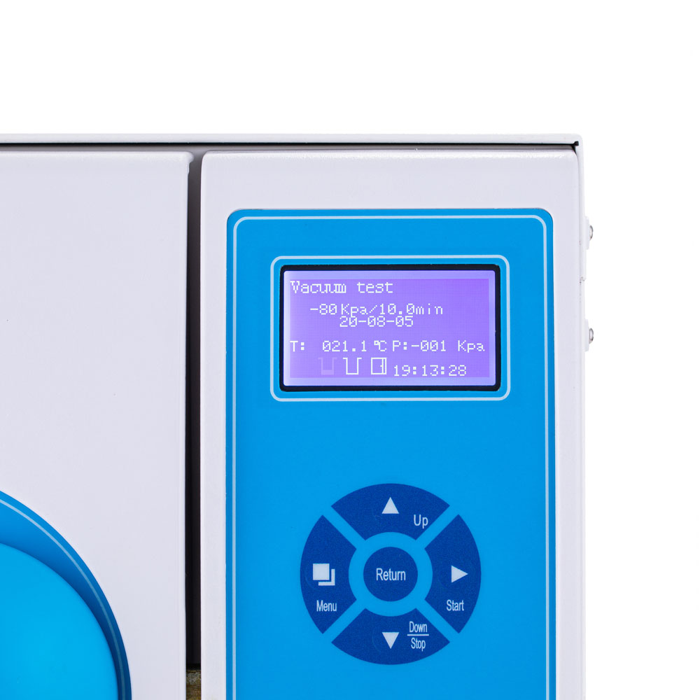 На лицевой панели расположены понятные кнопки управления и информативный ЖК-дисплей, на котором отображается дата, выбранная рабочая программа, температура в камере, время стерилизации, подключение термопринтера, количество чистой и отработанной воды, положение дверцы стерилизатора, а также температура и давление в помещении, где установлен прибор.