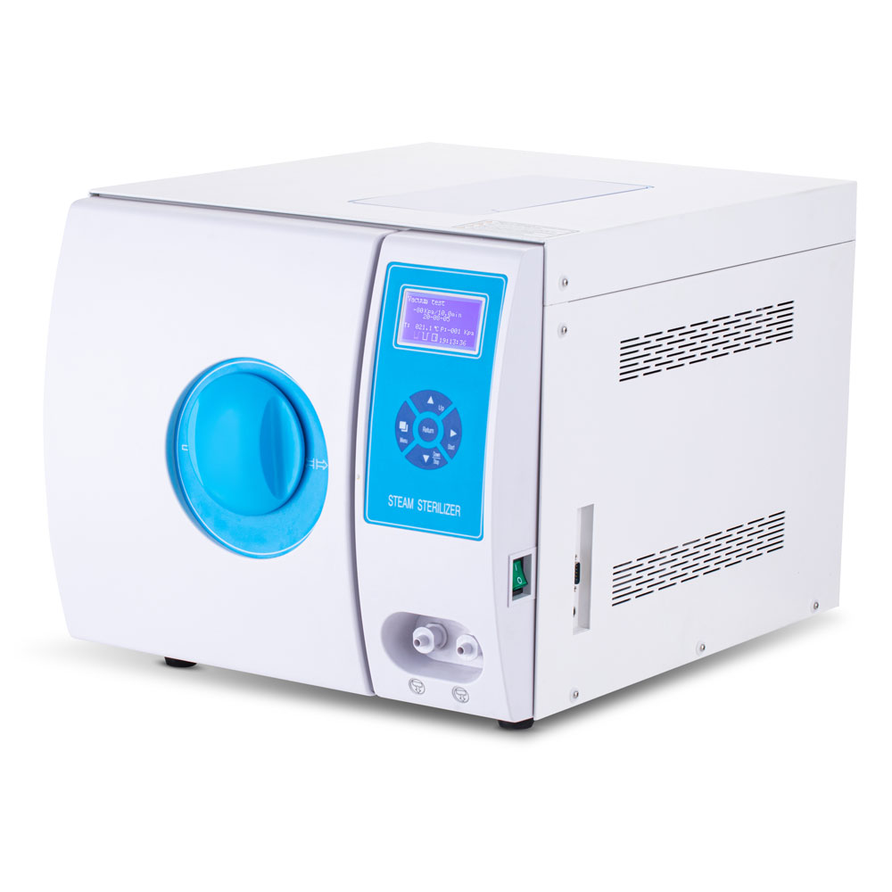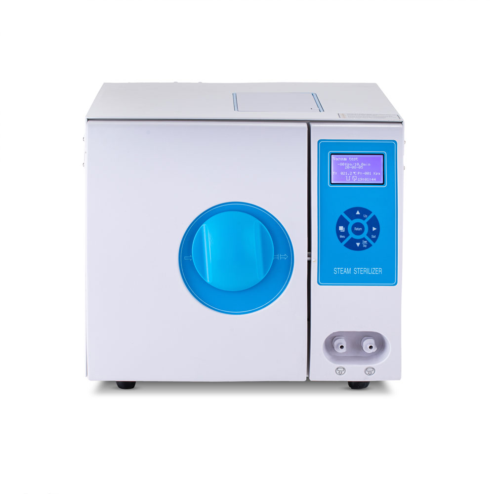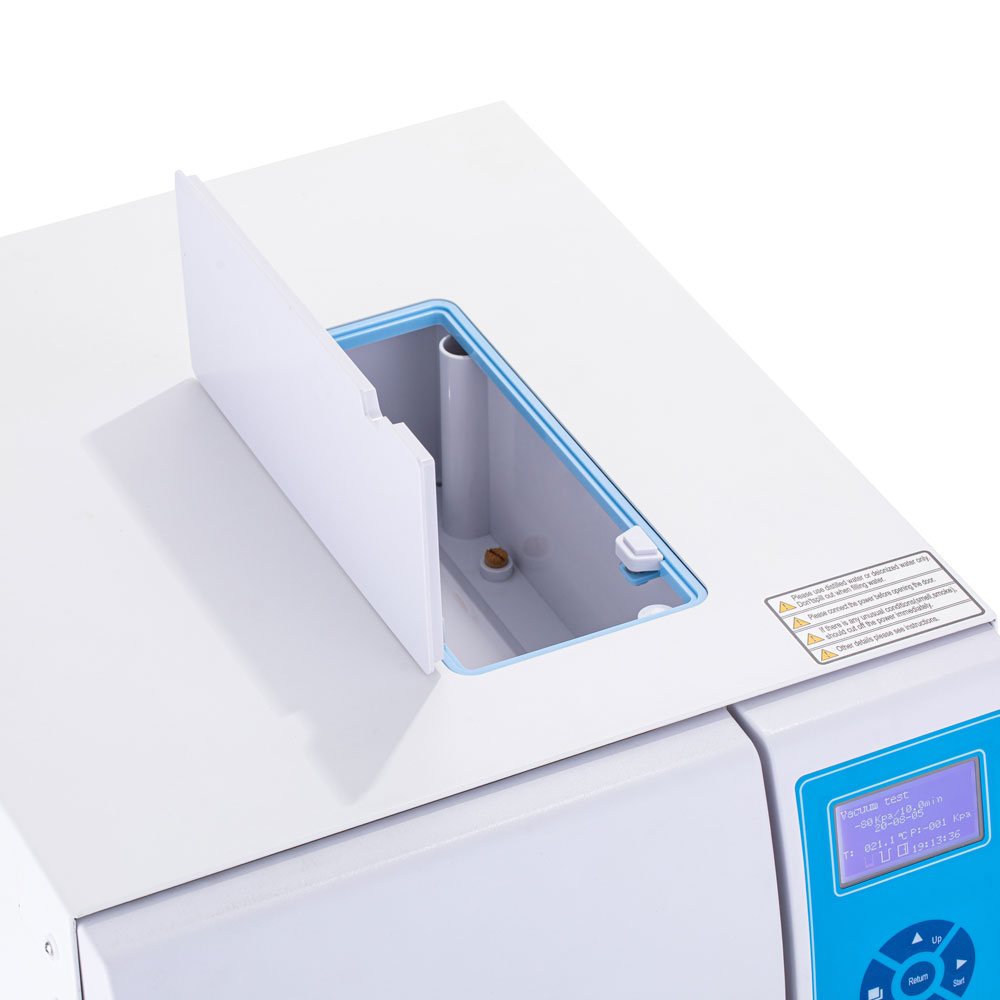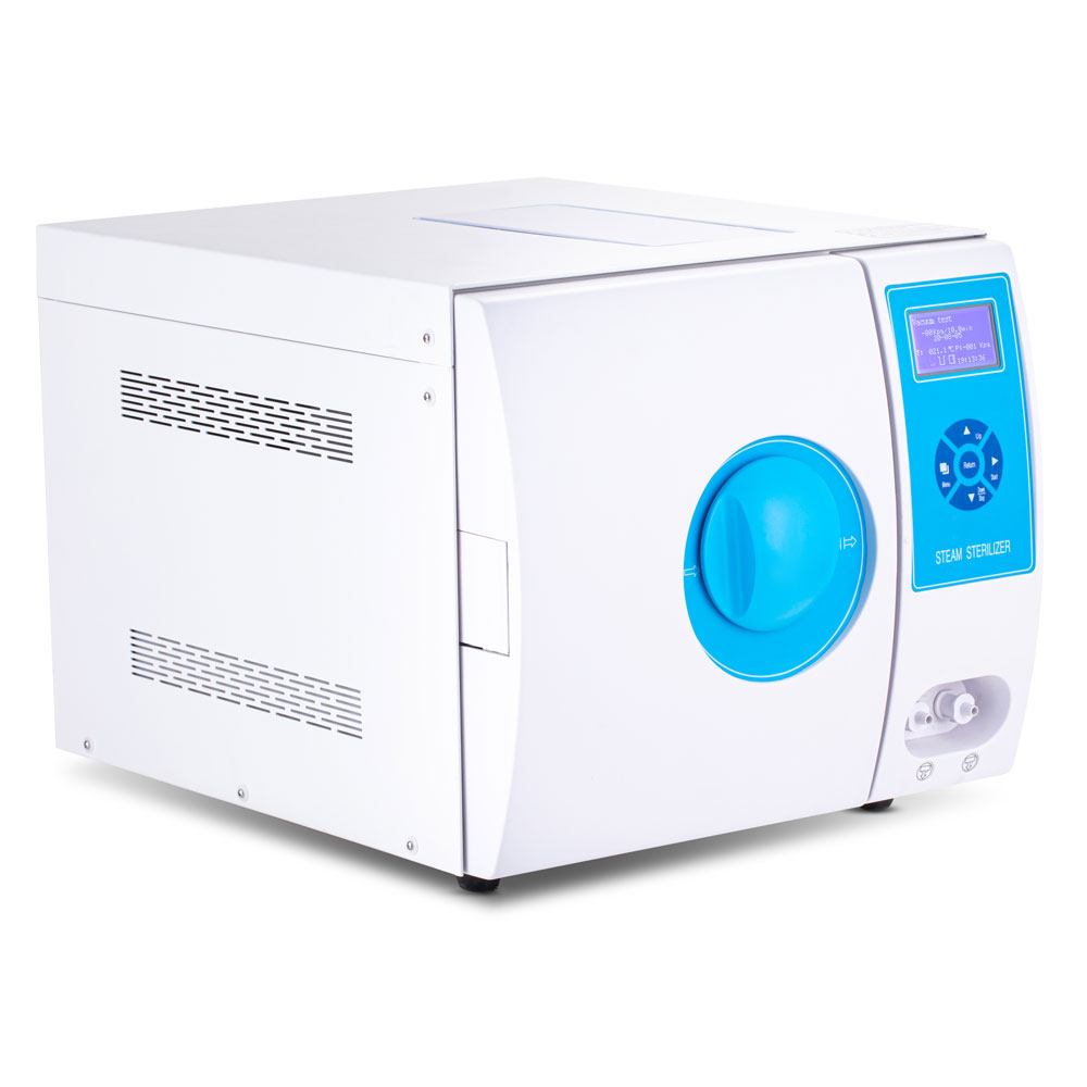 На лицевой панели расположены понятные кнопки управления и информативный ЖК-дисплей, на котором отображается дата, выбранная рабочая программа, температура в камере, время стерилизации, подключение термопринтера, количество чистой и отработанной воды, положение дверцы стерилизатора, а также температура и давление в помещении, где установлен прибор.