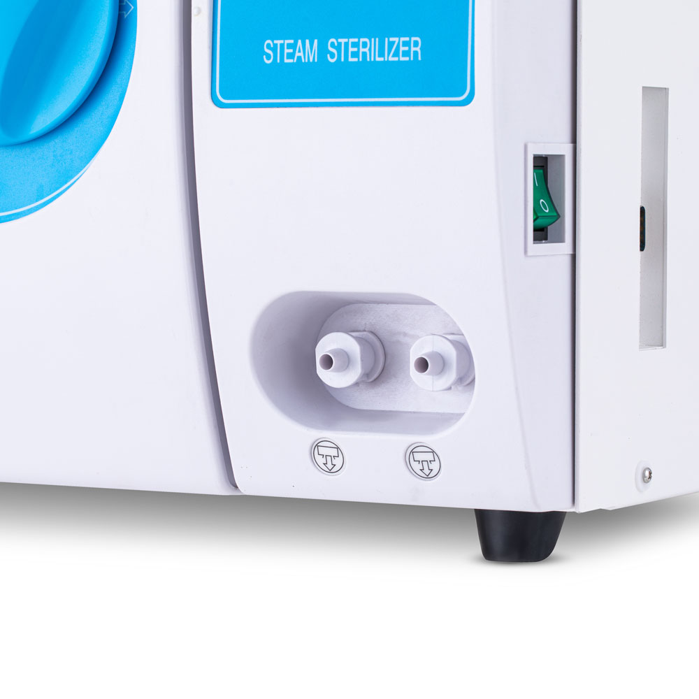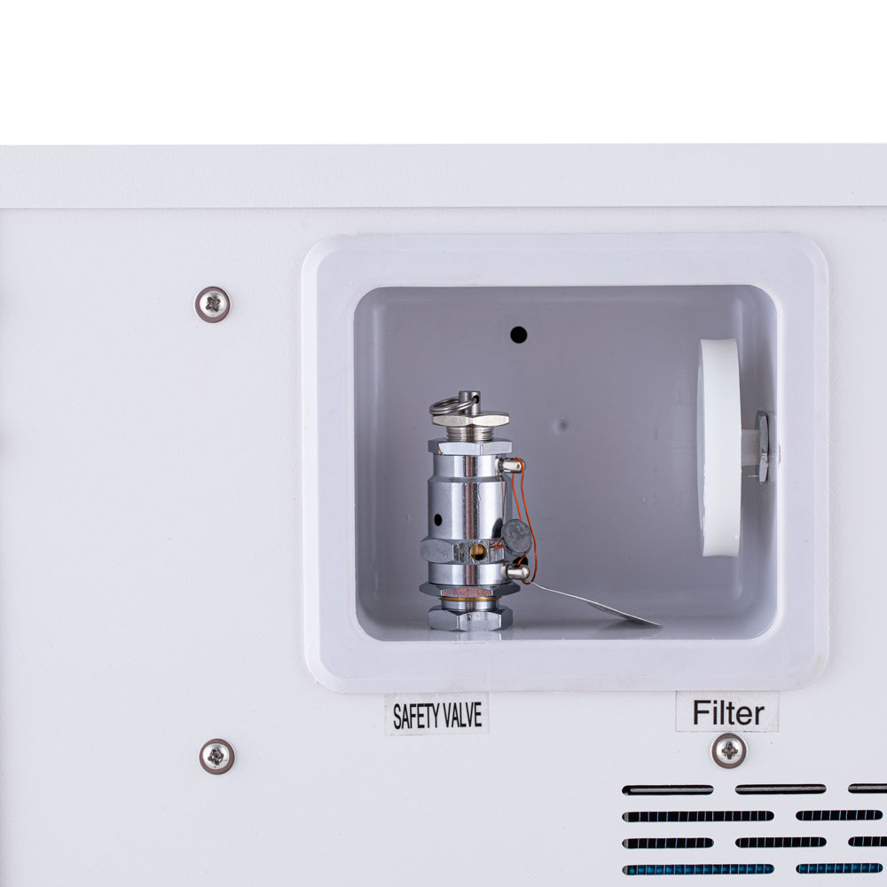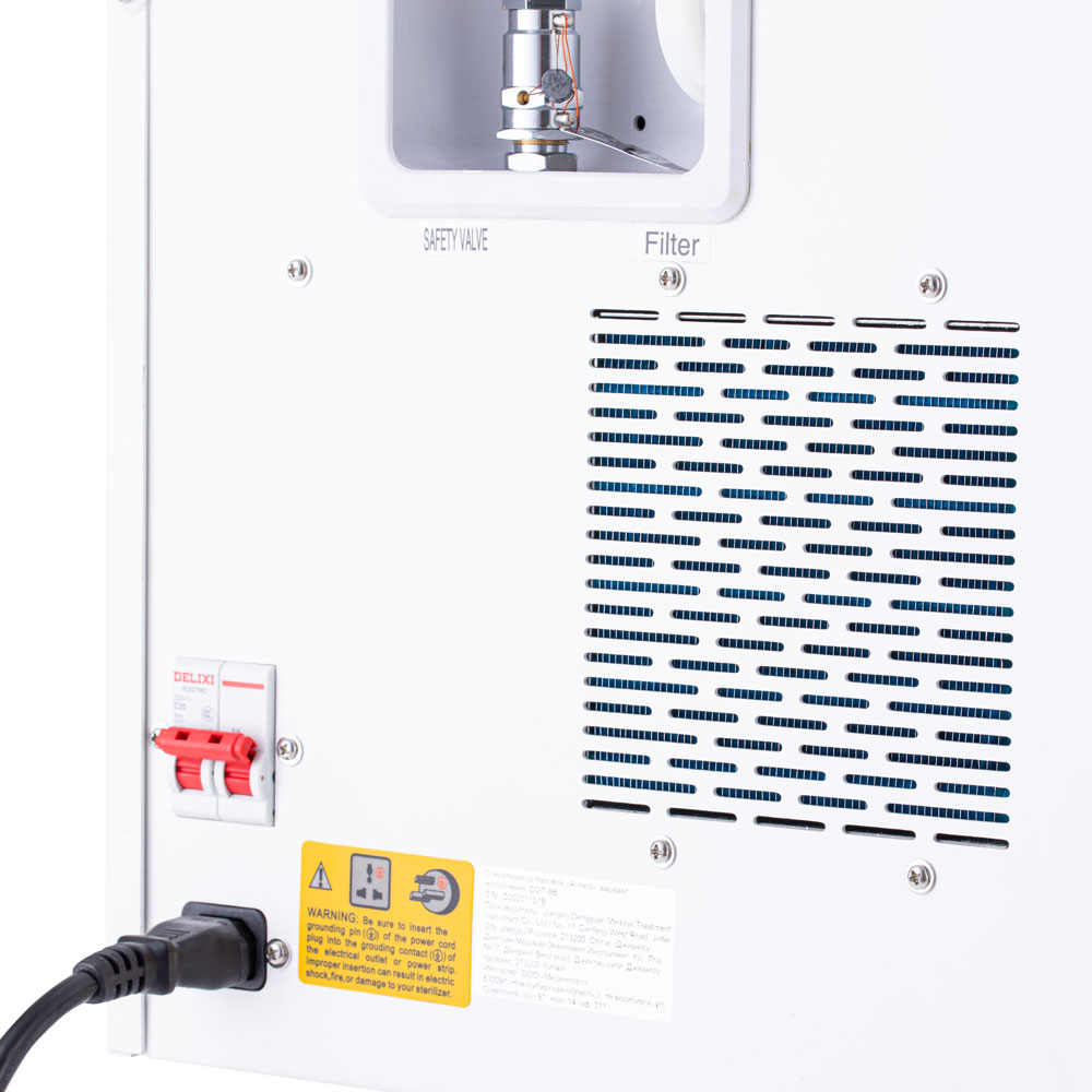 Для безопасности работы предусмотрена термозащита нагревательного элемента стерилизатора и предохранительный клапан на случай превышения допустимого давления в камере. После 15 минут бездействия происходит автоматическая блокировка дверцы, а при опустошении водяного бака и переполнении бака для отработанной воды раздаётся звуковой сигнал.