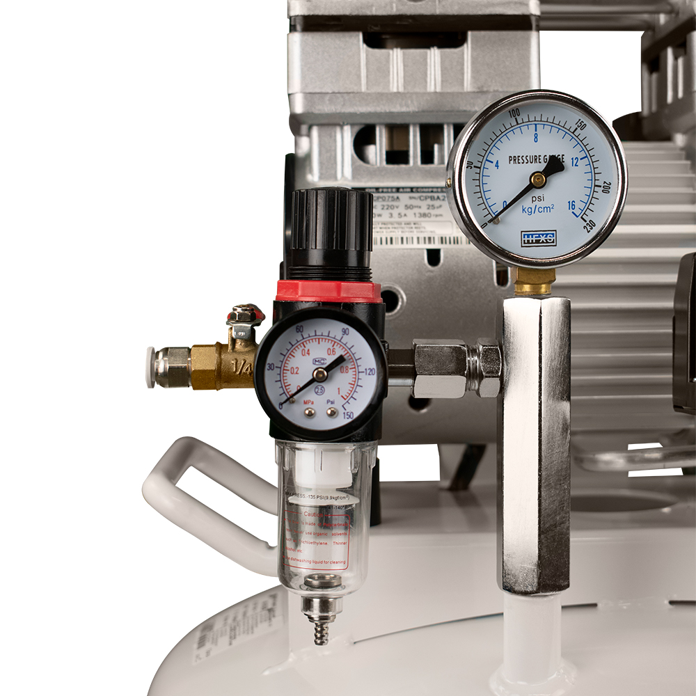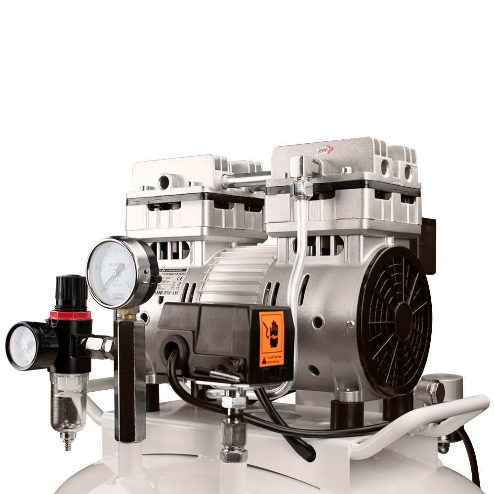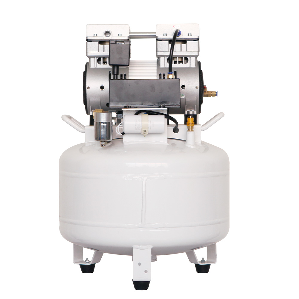 Безмасляный воздушный стоматологический компрессор модели JW-032B применяется для получения чистого сжатого воздуха без примесей масла, необходимого для приведения в движение зубоврачебного оборудования. Работает компрессор за счет самосмазывающегося материала, представляющего собой полимер с невысоким коэффициентом трения.