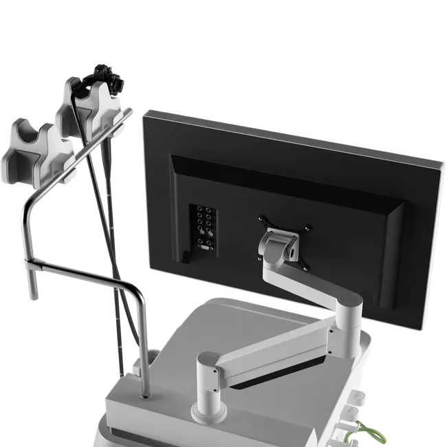 Видеоэндоскоп может работать в режиме двух мониторов – с выводом фото- и видео в белом свете и в узком спектре (CBI+). А функция стоп-кадра позволяет получать статичные картинки с видео в реальном времени. USB-порт применяется для присоединения внешних носителей для записи исследований, а также для управления клавиатурой.