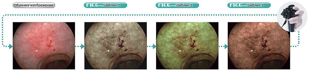 Алгоритм FICE - методика высококонтрастного цветового выделения, усиливающая цветовой тон картинки за счет анализа спектральных компонентов первоначального снимка. FICE позволяет сделать эндоскопическую диагностику различных анатомических участков более достоверной. В видеосистеме EPX-3500 предусмотрено три шаблона FICE. Между режимами FICE можно легко переключаться с помощью нажатия кнопки на эндоскопе.