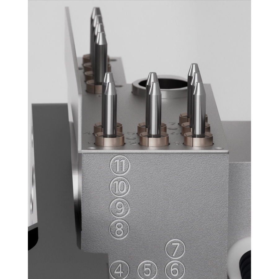 Станок P53 PLUS оснащен магазином фрез на 11 позиций с автоматической заменой в зависимости от этапов обработки Такое решение закрывает полный спектр изготовления базовых работ в вашей стоматологии или лаборатории.