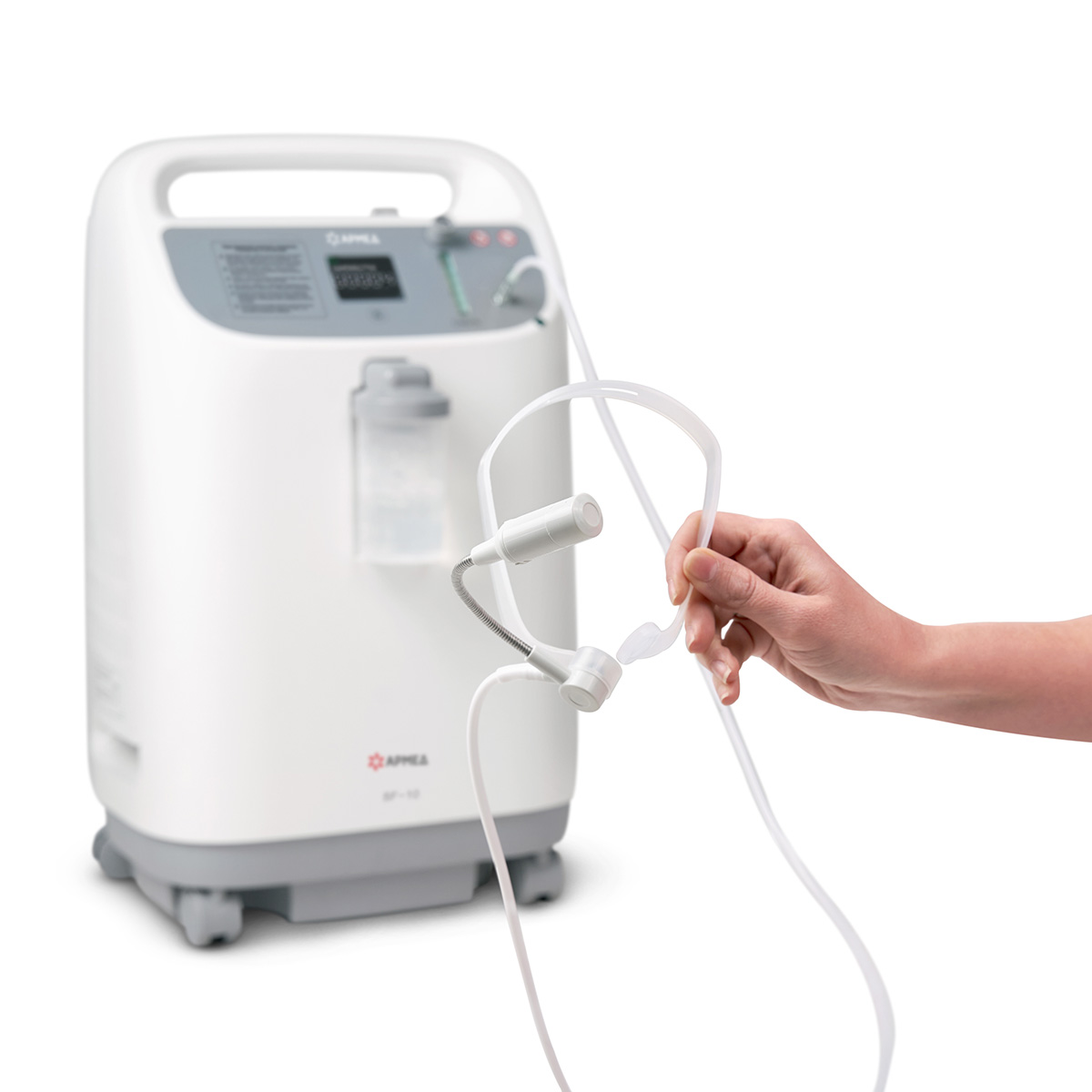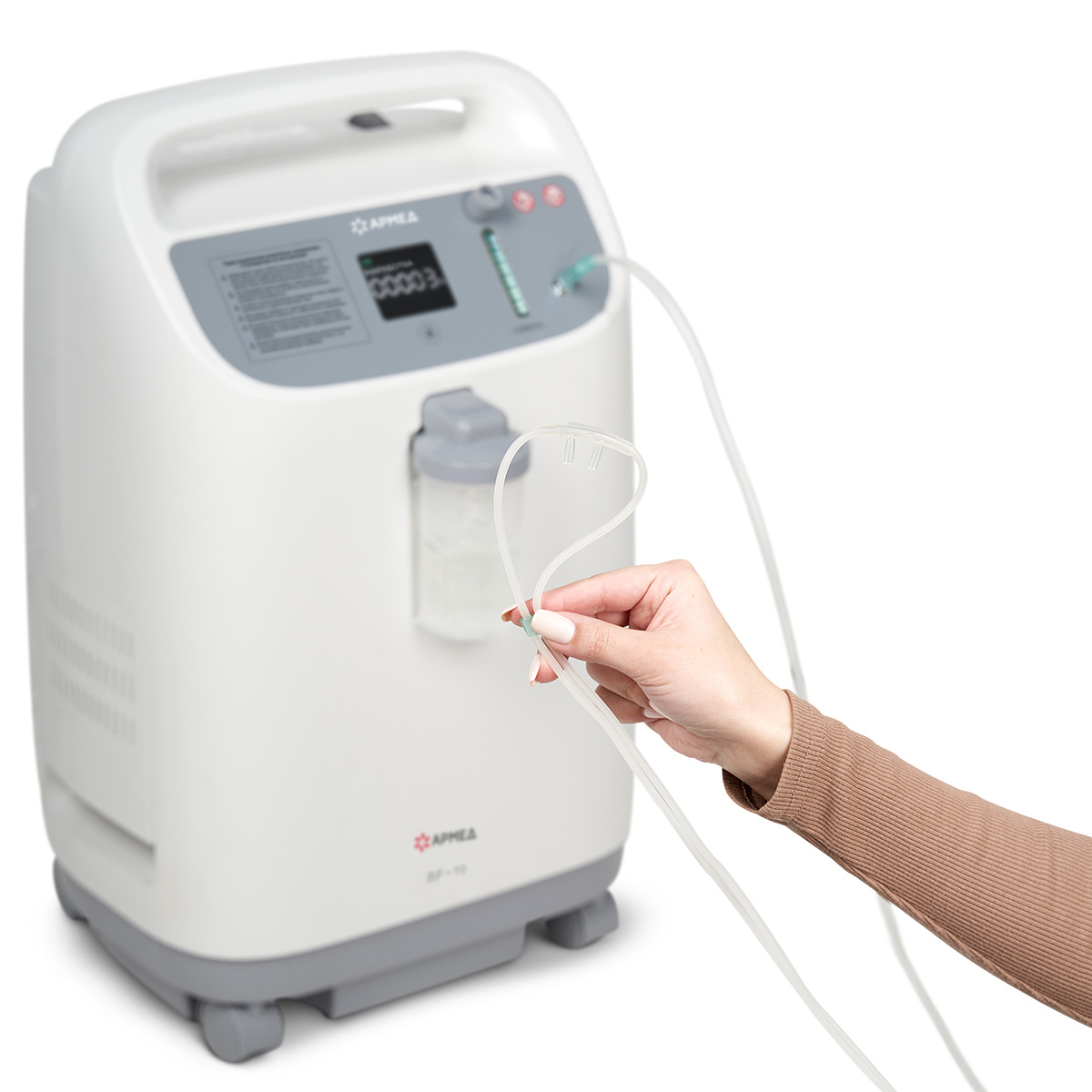 В комплекте с концентратором кислорода поставляется два диффузора и две назальные канюли длиной 2 м и 5 м. Диффузор универсального размера имеет гибкую трубку, подстраиваемую под параметры пользователя, и предполагает многоразовое использование. Длина соединительных шлангов позволяет находиться на удобном расстоянии от прибора, не привязывая место процедуры к расположению розетки питания.
