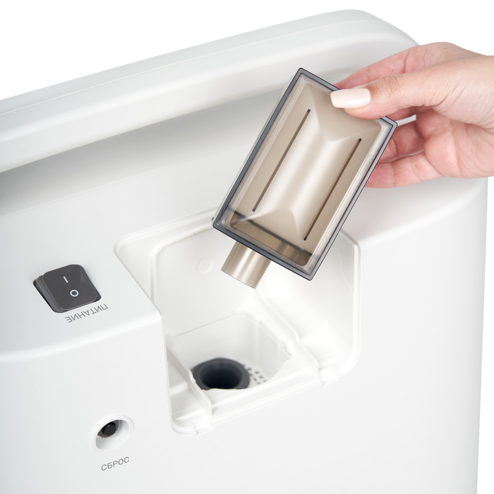 Концентратор кислорода оснащён фильтрами грубой и тонкой очистки. Фильтр грубой очистки расположен в боковой части корпуса и предохраняет прибор от попадания пыли и крупных частиц грязи. Фильтр тонкой очистки находится сверху и защищает от посторонних микрочастиц. Фильтры защищены от повреждений пластиковыми крышками, просты в уходе и замене. В комплекте поставляется запасной фильтр грубой очистки.