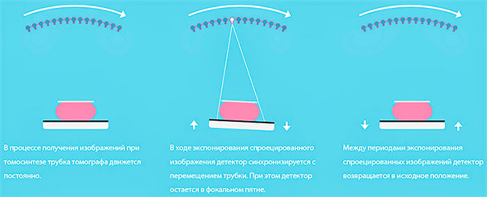 Все полученные снимки отправляются на компьютер, где формируются в общее послойное изображение, отображающее с максимальной точностью реальное состояние тканей молочной железы.