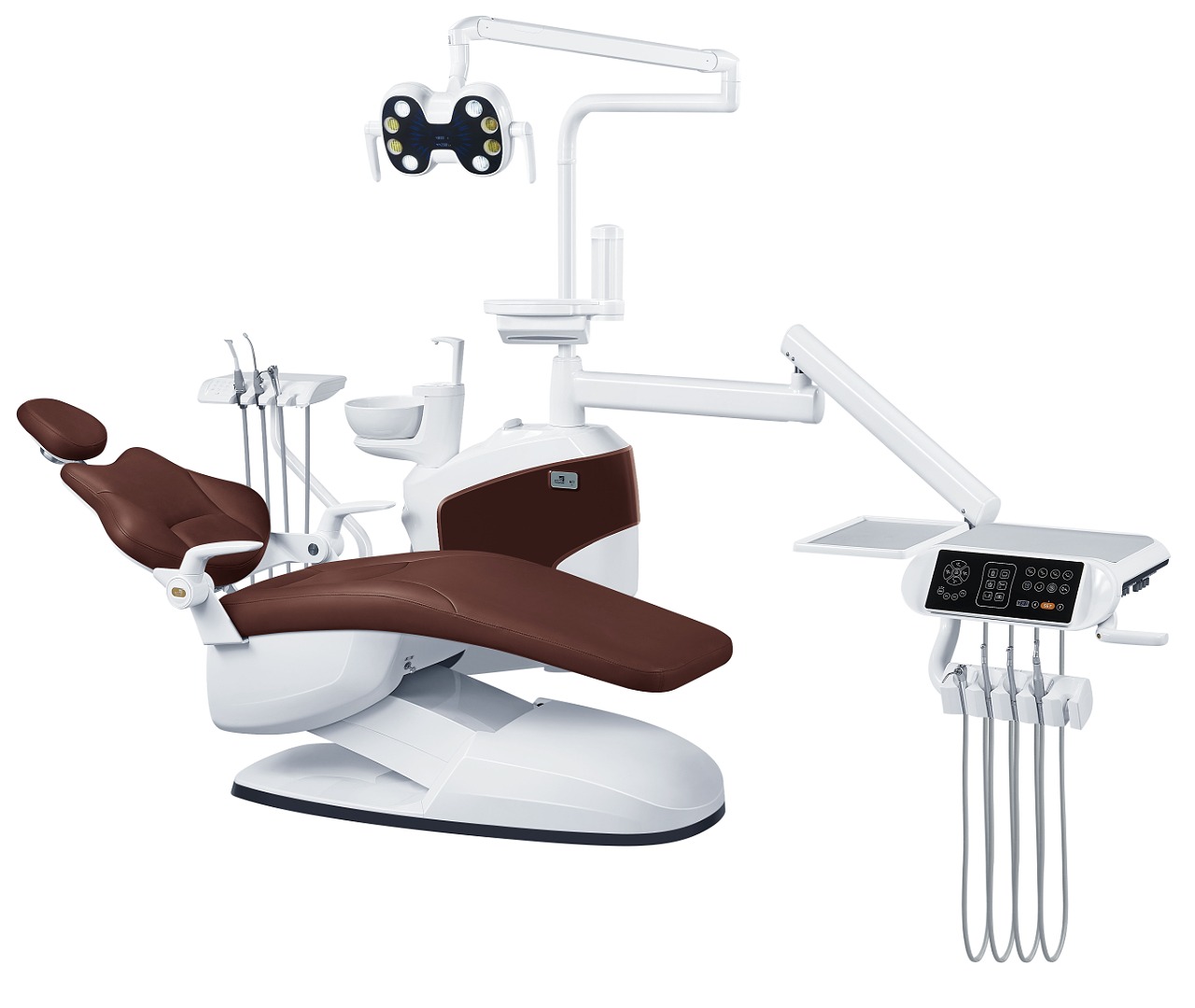 Блок управления креслом пациента запрограммирован на три основные положения, дополнительно в каждой программе содержится 3 подпрограммы. В нем предусмотрена кнопка возврата в нулевое положение, есть фиксированное положение для сплевывания.