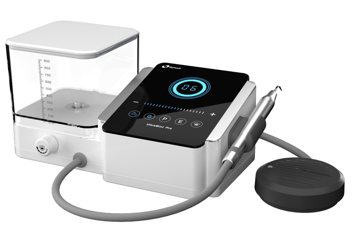 Ultramint Рго под разъем EMS Eighteeth - автономный ультразвуковой скалер, с сенсорным управлением защищённым от воды, умная система, которой можно управлять даже в перчатках, с резервуаром на 900 мл. В комплекте один съемный автоклавируемый наконечник для насадок стандарта EMS с соответствующим набором насадок.